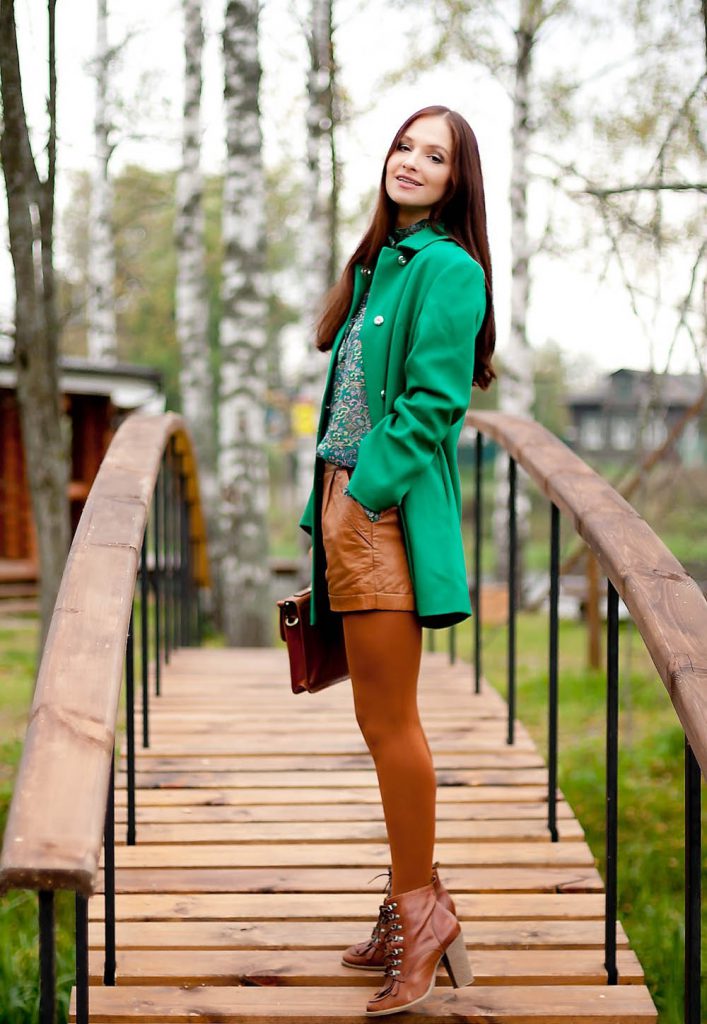- Можна носити коротке пальто зеленого кольору з міні-спідницею.