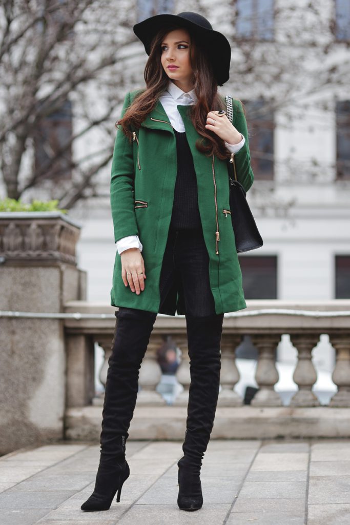 Крім того, можна носити з зеленим пальто, капелюх і шарф аналогічного кольору, а також темно-зелені жіночі черевики або чоботи.