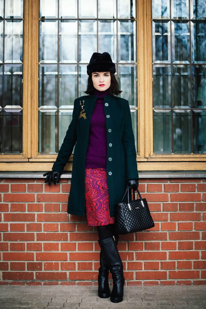 - Не кращий варіант — пальто максі з зеленими аксесуарами (виходить не красивий образ, а подоба новорічної ялинки).