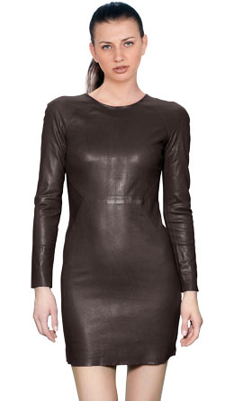 1. Для цінителів романтики відмінно підійде модель у формі A коричневого кольору з облягаючим ліфом і розширюється до низу спідницею. До такого вбрання гідним доповненням буде скромна біжутерія з елементами золота і срібла у вигляді намиста і товстих ланцюжків. А вибравши чисто золоті прикраси, буде підкреслений шик шкіри. До коричневого сукні зі шкіри правильно підбирати сумку з такого ж кольору і матеріалу. На вечірку можна вибрати і клатч, тоном світліше, з ручками, так і без них.