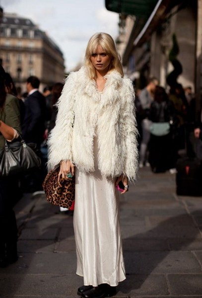 До дивовижного шовкової сукні з такого матеріалу ідеально підійде стильна горжетка з білого хутра.