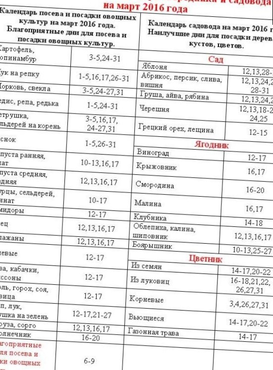 у березні 2017 року, найбільш несприятливим періодом для посадки і посіву всіх овочевих культур буде 6-9 березня. У свою чергу, найсприятливіші дні для