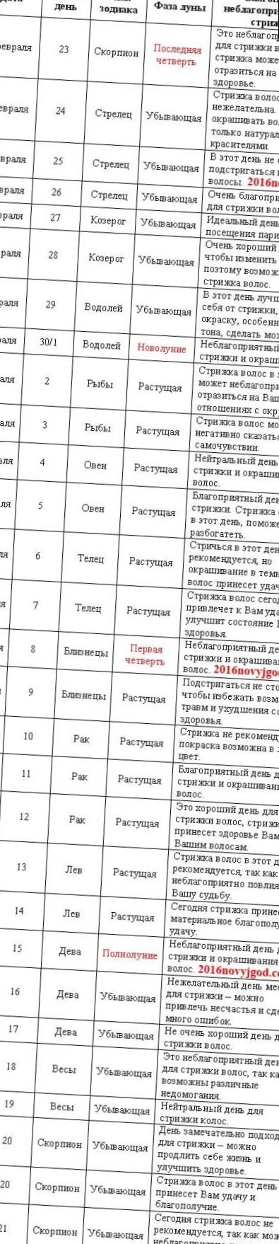 Якщо заглянути в календар, де розраховано вдалий час для походу до фахівця в обрізанні волосся в лютому 2017 року, можна побачити, що на вдалий результат