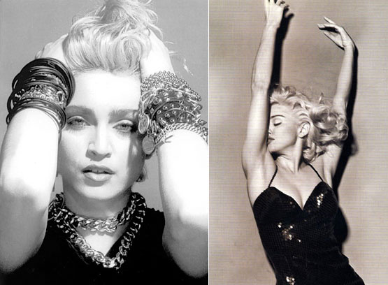 За ці роки її переваги в стилі розвивалися разом з її музикою. Вона носила — мереживну білизну замість верхнього одягу, рукавички без пальців, браслети, розп’яття, як у Діви, чорна шкіряна куртка і біла футболка, плюс платинова копиця з синявою, знаменитий бюстгальтер у формі конусів і гостро скроєні брючні костюми від Gaultier для блондинки з амбіціями – пережиток 70-х, епохи глем і диско, завершуються чепчиком Farrah Fawcett.