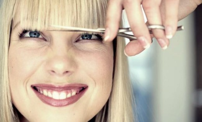 - Розділіть отриману чубок на дві рівні частини і підстрижіть кожну з них окремо, рухаючись від середини лоба до скронь. При цьому уважно стежте за дотриманням симетрії.