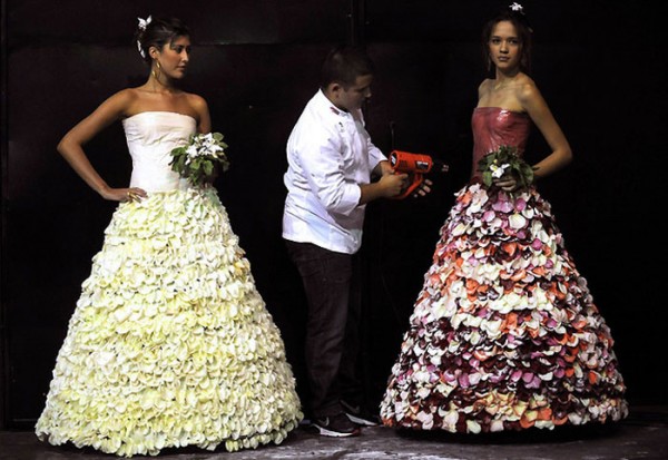 З-за недовговічності зірваної квітки прикрашають модель живими пелюстками тільки для показів на один раз. А в житті елементи квітки замінюють штучними, та так акуратно, що й не можна відрізнити.