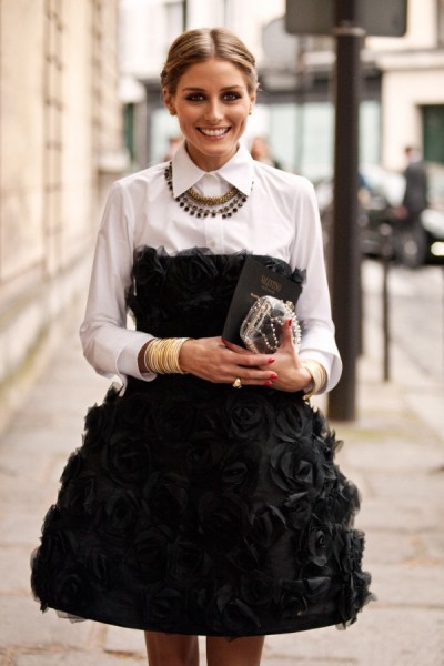 Модне у всі часи класичне чорне плаття в останньому сезоні представлено з трояндами, як додаткова деталь. Особливо вигідно виглядає коротке плаття з об’ємною трояндою в тон на одному плечі, коли друге повністю оголене.