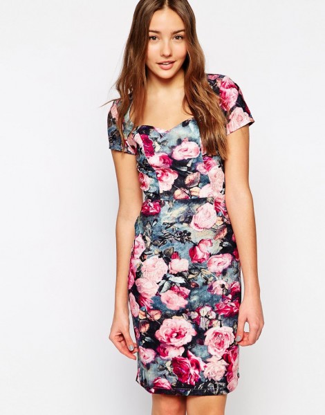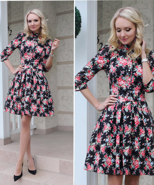 Ідеальним нарядом стане плаття до середини стегна з вибитими трояндами на тканини типу габардину. Останнім часом особливою популярністю користується тканина з набитими малюнками, не відрізняються за кольором з матеріалом, так чому б і не троянди.