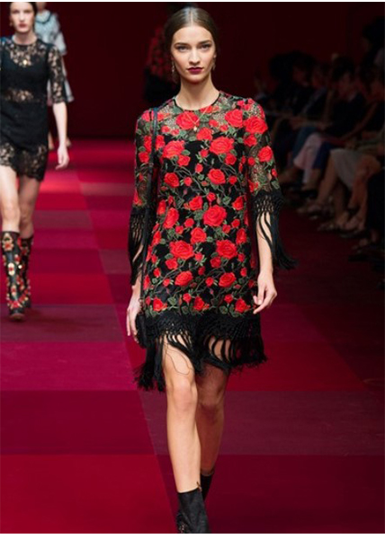 Не виходять з моди короткі чорні міні-сукні з великими червоними трояндами, а також поєднання сталевого відтінку з глибоким рожевим кольором.