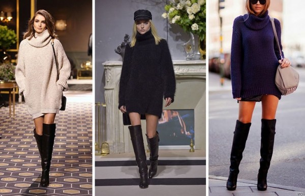 Сукня-светр виступає в дуеті не тільки з джинсами або лосинами. Темні матові колготи також є стильним атрибутом в цьому ансамблі. Вони тримають ніжки в теплі і за законами сумісності правильно підкреслюють привабливість сукні-светри. Якщо останнє має простий нехитрий крій – яскраві фарби на колготах зможуть творчо перетворити цибулю. У випадку зі сміливими варіантами сукні колготи мають бути максимально нейтральними.