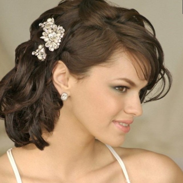 На темному волоссі добре будуть виглядати світлі білі прикраси. Весільна зачіска на коротке волосся
