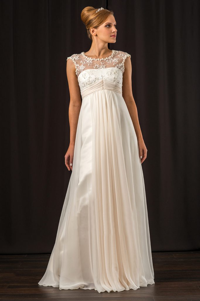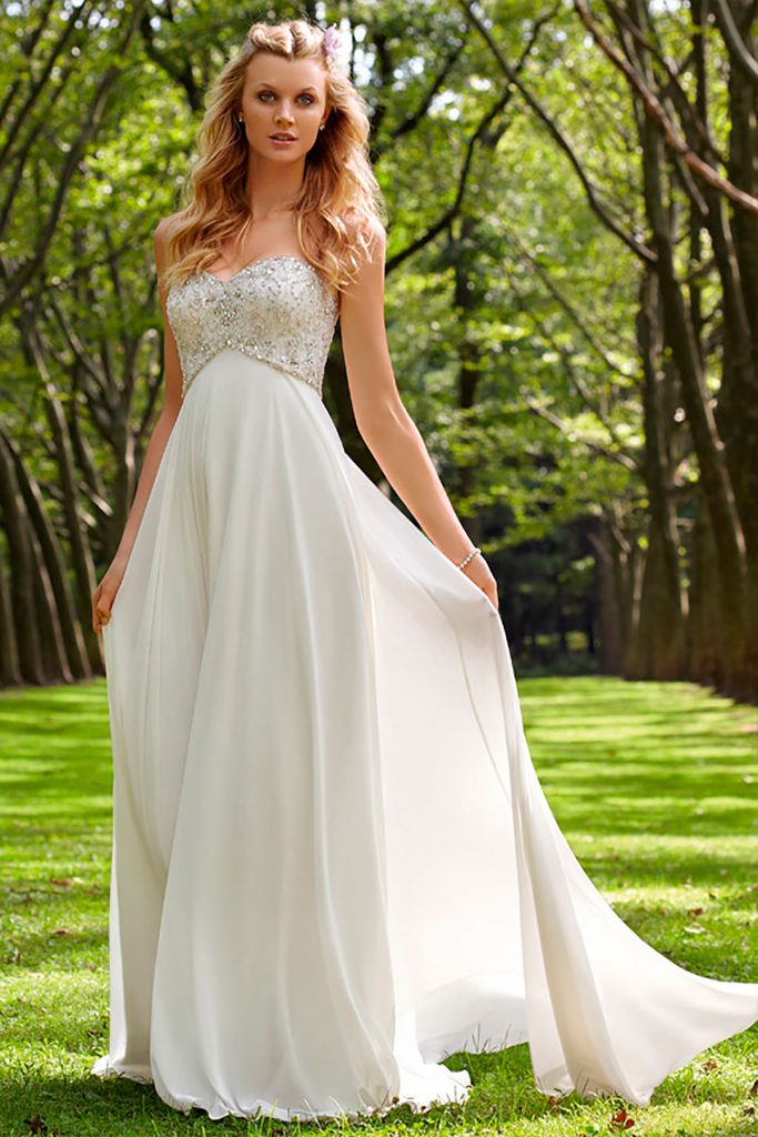 Ідеальний варіант для вагітних наречених – весільний наряд в стилі ампір. Нареченій в такій сукні буде зручно, воно не тисне на живіт, не викликає дискомфорт для майбутньої мами і її малюка. Навіть якщо термін вже великий, то фігура в такій сукні буде здаватися пропорційне, ніж у вбранні іншого фасону.
