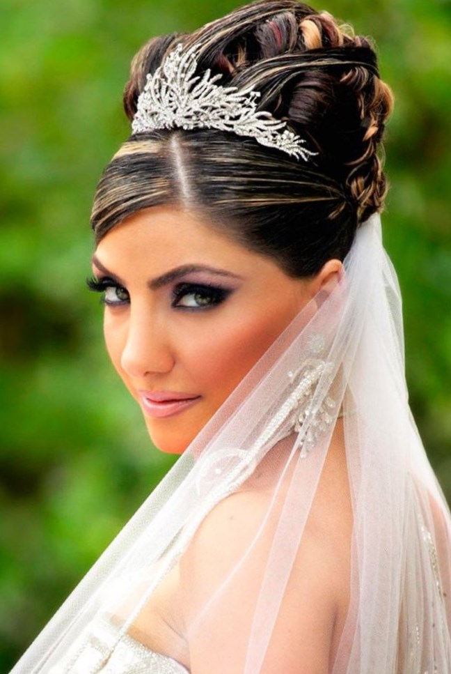 Виразний весільний макіяж з накладними віями і весільна зачіска високий пучок з діадемою для темно-русявого волосся