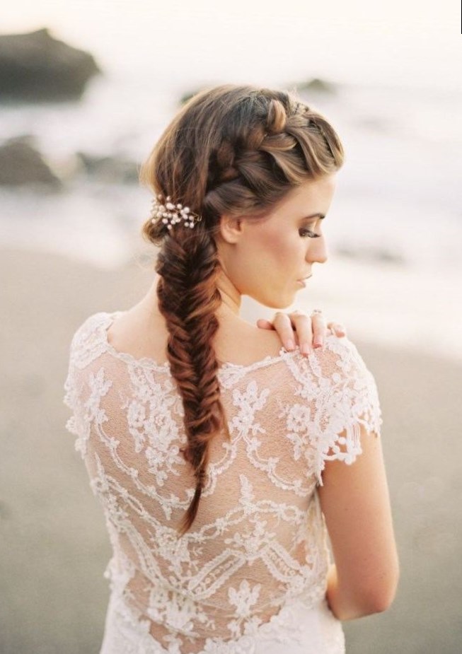 Це і елегантна коса на бік, і африканська коса, що йде під коріння волосся, і зухвалий риб’ячий хвіст, і ніжні плетіння через голову, що обрамляють обличчя нареченої.