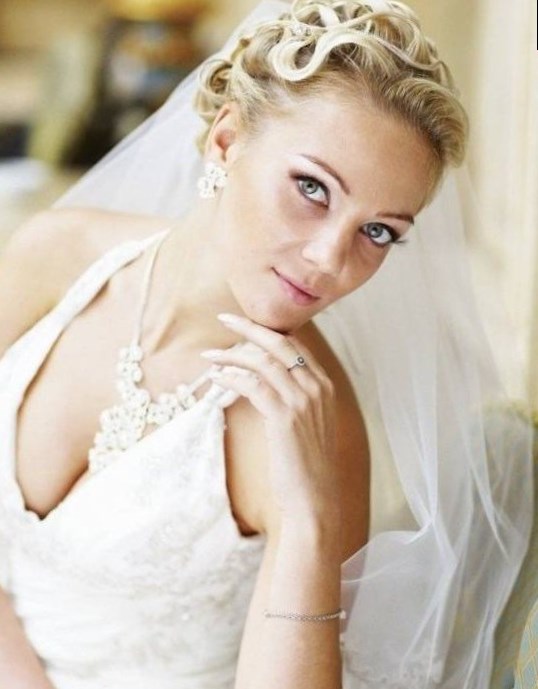 Вибір весільних зачісок з фатою на середні волосся є найбільшим. В останні роки популярними