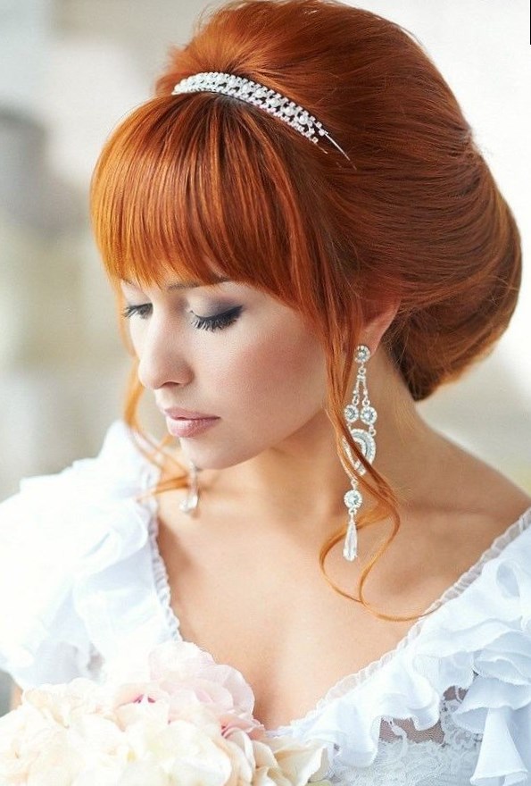 весільна зачіска з діадемою. Особливо це стосується прямих густих чілок, довжиною до брів. Такий варіант буде безпрограшним як для довгих,