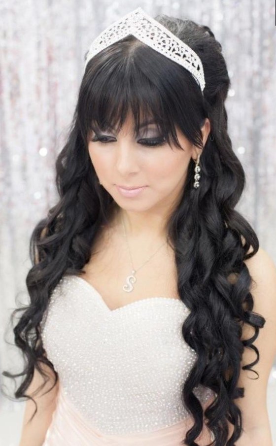 Дівчатам з чубчиком дуже підходить діадема з фатою, при цьому коротку чубок залишають як є, а довгу можна красиво укласти набік хвилею.