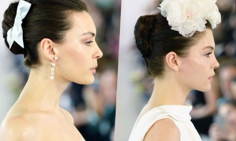 Щоб зробити образ менш суворим, зачіску можна прикрасити живими квітами і випустити кілька пасом наприклад, як на показі Carolina Herrera.