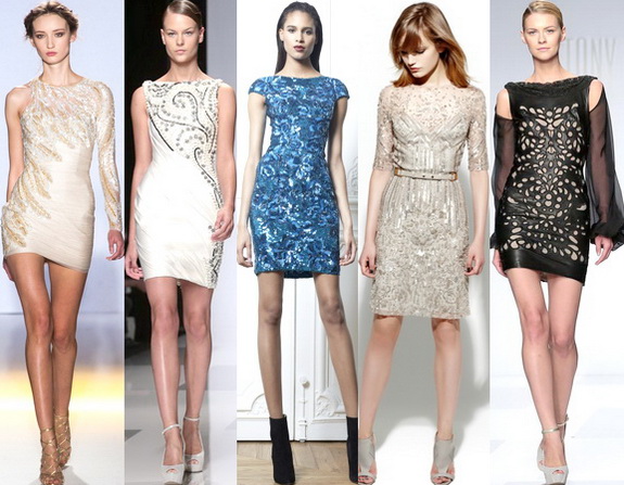 На модних подіумах можна спостерігати дві основні тенденції, а саме, широко відомий блиск, виражений через металізовані тканини, золото, срібло або блискітки і класичний чорний у поєднанні з мереживами або транспарантными вставками.