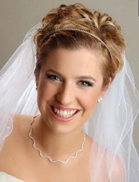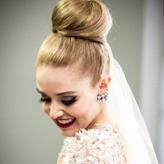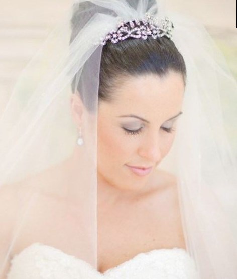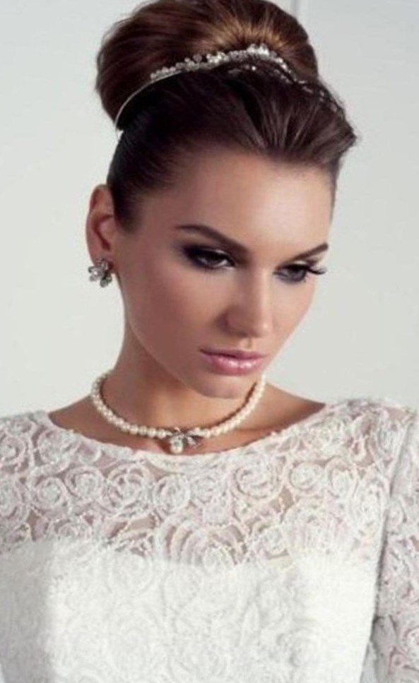 високий пучок з фатою і квітами. Діадема гарно прикрашає весільні зачіски як розпущене, так і красиво зібрані стилістами з коротких і