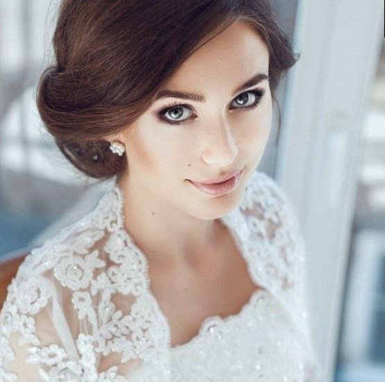 Виразний весільний макіяж з накладними віями і весільна зачіска високий пучок з діадемою для темно-русявого волосся