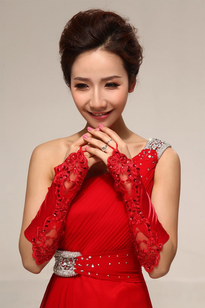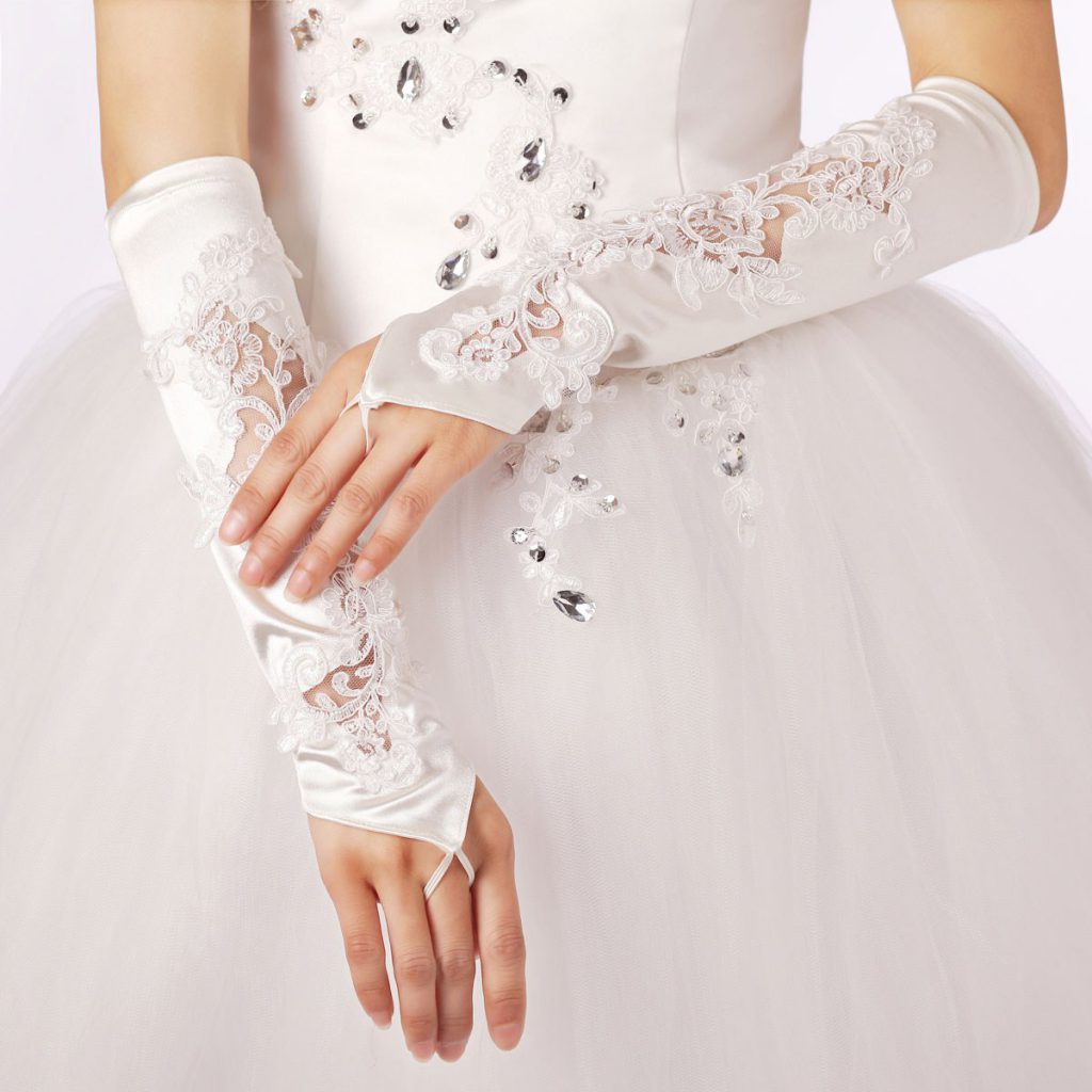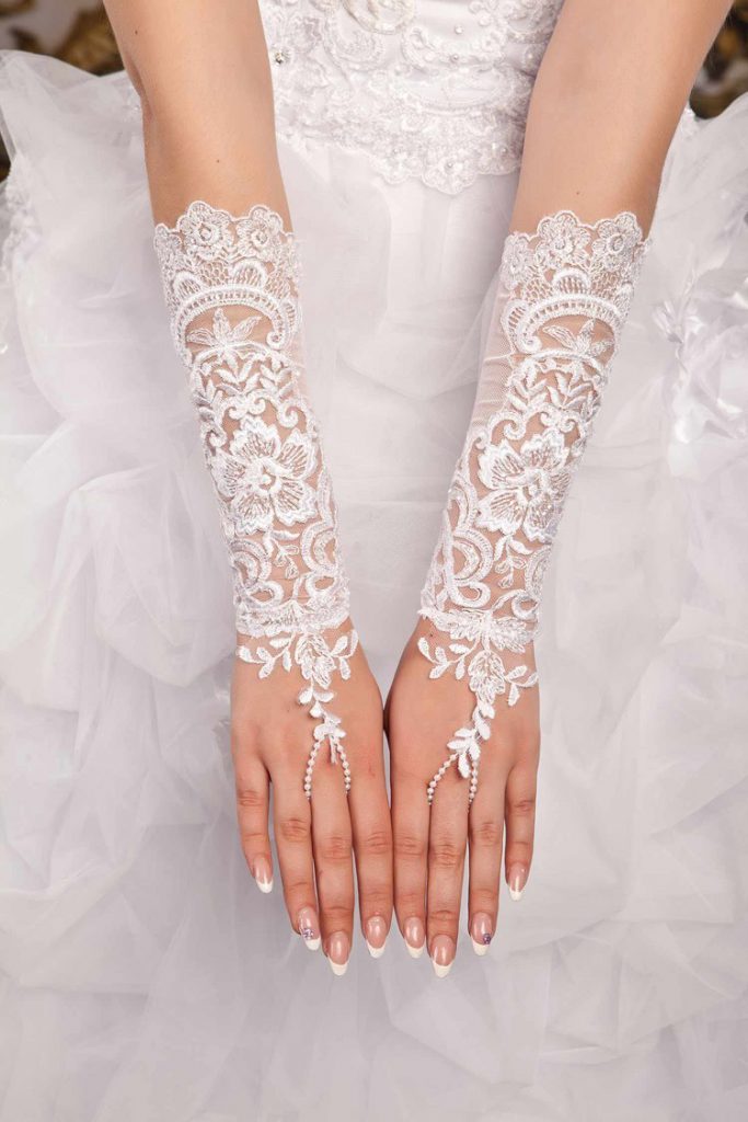 Можна підібрати рукавички для нареченої з пальцями або без них. Перший варіант робить ручку дівчата витонченою і ніжною, уособлює її невинність і чистоту. Але такий аксесуар під час застілля може забруднитися, він не підійде до занадто довгому манікюру нареченої, під час одягання обручки також може виникнути заминка.
