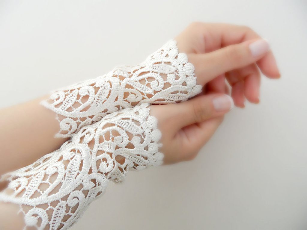 Деякі нареченої вирішуються самі виготовити для себе рукавички. Серед найпростіших варіантів – виготовлення митенок з сіточки. Спочатку зшийте трикутну верхню частину, до неї пришити стрічку-петельку, прикрасьте готовий виріб мереживом, стразами або намистинами. Включіть свою фантазію і власний смак.