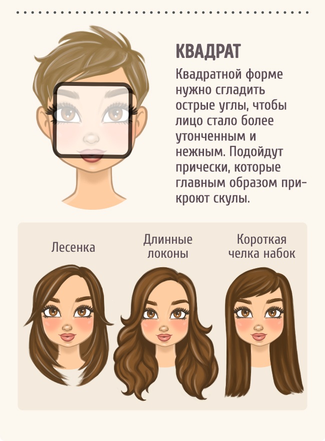 Вибрати зачіску жінкам з «квадратної» формою обличчя нескладно. «Округляти» особа краще всього м’якими асиметричними лініями з об’ємом на маківці. Широкий лоб вдало приховає легкий чубчик.