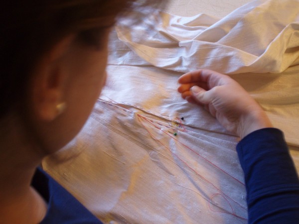 На цьому етапі нашого процесу ми жахливо спізнювалися. Моя модель виглядає простий і О БОЖЕ, вона непроста. Зміни з’їли цілих два дні, і ми повинні були повернутися в Сан Франциско. Отже, Девід і я не спали до опівночі, жартували про Проект «Бігова доріжка», і дуже обережно розрізали і відзначали ярди і ярди шовку. Розрізання тканини цю вправу в точності. Після магії, яка брала участь у зміні моделі, вам потрібно розрізати тканину надзвичайно точно, і переконатися, що вона розкладена дуже правильно за текстурою тканини. Після того, як вона вся розрізана, ви використовуєте нитку, щоб відзначити всі зазначені точки в тканини.