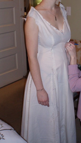 У той час як цей крок є величезним тягарем, я б ні за яких обставин не радила пропускати його. Тут робиться вся дійсно важка робота. На цій стадії ви робите свої вимірювання, отримуєте модель, ріжете і відзначаєте тканина, робите невеликі зміни, які плануєте (для нас це прибрати рукава!) і сшиваете сукню. Зараз у вас є дивне муслиновое сукню. Воно буде ВЕЛИЧЕЗНИМ (я ношу четвертий розмір, згідно Vogue, у мене 12 розмір, ми пошили 10 розмір, і воно все ще було до біса великим на даному етапі). Також, відверто кажучи, воно буде не дуже вдало виглядати на даній стадії (дивитися фото внизу), але не панікуйте. Воно буде вдалим після.