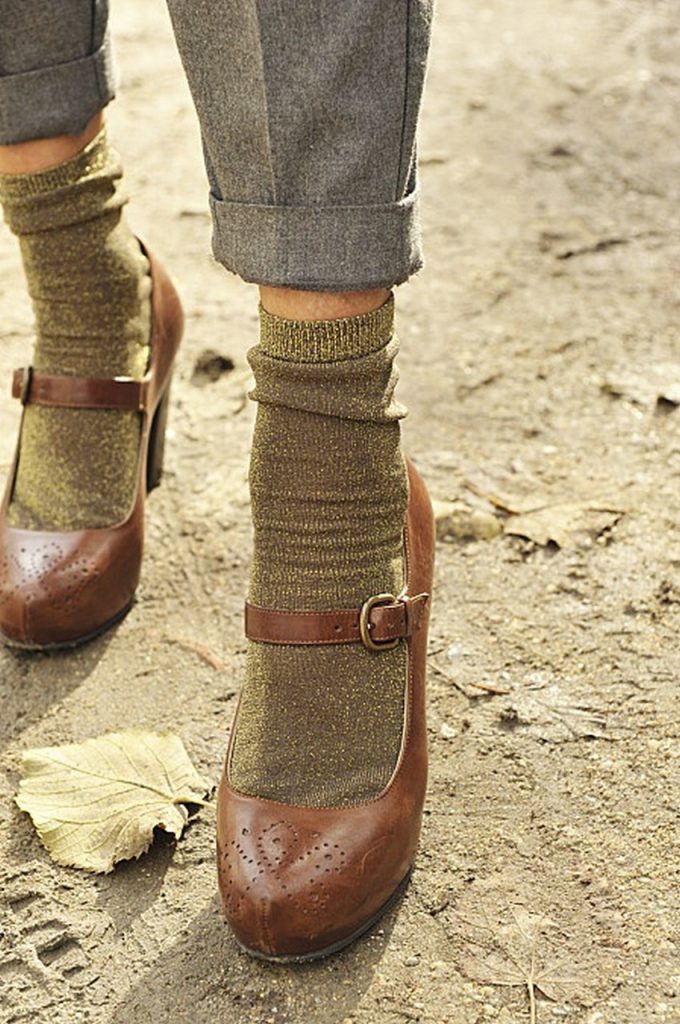 - Темні шкарпетки: мода виводить на п’єдестал сірі, коричневі і насичено-сині моделі. Для матовою і лакованої шкіряного взуття актуальні чорні шкарпетки. Їх, до речі, можна трохи приспустити на туфлі, щоб домогтися ефекту легкої недбалості. Сірі шкарпетки добре виглядають з класичними туфлями «Мері-Джейн». У будь-якому випадку взуття повинна бути яскравіше, ніж шкарпетки. Якщо є декор, то взуття повинна бути в тих же колірних тонах. Трохи зухвало, але ефектно виглядають темні «чоловічі» шкарпетки з золотавими або сріблястими босоніжками.