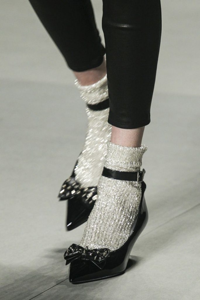 - Дуже короткі шкарпетки з’явилися в колекції Mary Katrantzou. У них повністю відкрита п’ята! Для темної взуття правильно вибирати яскраві моделі, а кольорові босоніжки доповнювати більш світлими подследниками.