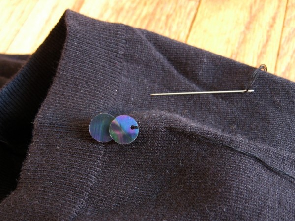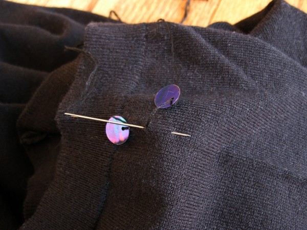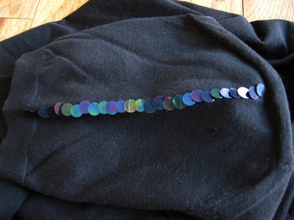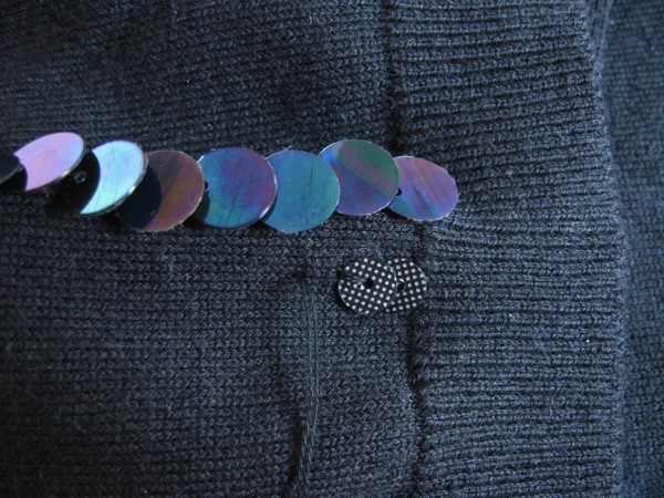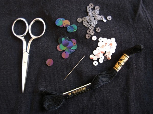 Походіть по магазинах, де продаються товари для рукоділля та тканини, у них можна знайти безліч цікавих штучок. А якщо вам пощастило, і ви живете в місті, в якому є «квартал моди», обов’язково відвідайте його в пошуках ідей і матеріалів. Для свого светра я взяла трохи чорних паєток з переливами, класичні сріблясті паєтки, а ще мені вдалося знайти паєтки з дуже рідкісним малюнком – чорні, в сріблясту цятку.