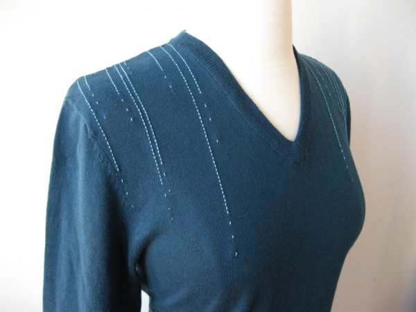 Прокладайте рядки там, де вам більше подобається. Я зробила вибір на користь вертикальних ліній, що йдуть від плечового шва – вони привертають увагу до особи. Ви також можете прокласти строчку від плеча до самого низу виробу, або діагональні рядки, або вибрати візерунок на свій смак.