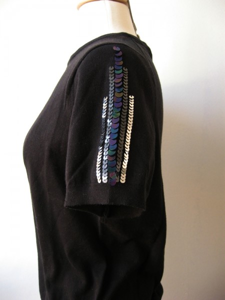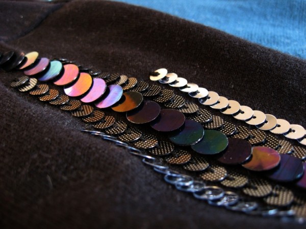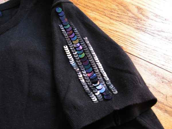 Я пришила паєтки на рукави, т. к. зазвичай ношу сумку на плечі, тому на плечах не повинно бути паєток. Крім того, оскільки всі блискітки на рукавах, я можу носити цей светр на роботу, накинувши зверху жакет. Про нових образах офісної одягу, читайте в нашій статті: 2015-2016 Офісний одяг для стильних, впевнених в собі жінок.