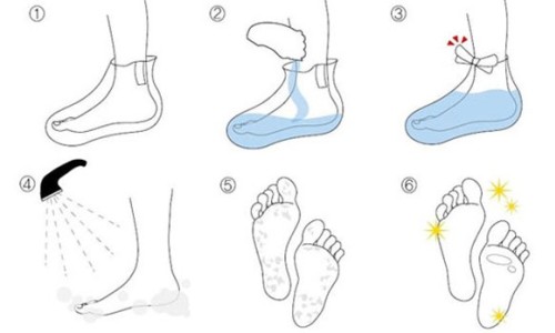 Японські і китайські шкарпетки для пом’якшення стоп являють собою поліетиленові футлярчики, внутрішня поверхня яких оброблена отшелушивающим і пом’якшувальною складом. Там і кислоти, масла і ще багато чого. Контактуючи зі шкірою, діючі речовини розм’якшують і знімають ороговілий шар епідермісу.