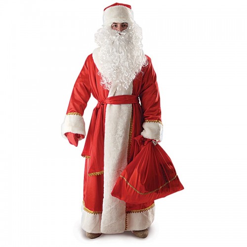 Атрибути такі: об’ємне довге червоне пальто і такого ж кольору штани, шапка-ковпак, манжети рукавів і штанів, оброблені білим хутром, широкий пояс, білі або червоні щільні рукавички, величезні чорні чоботи, а також перуку з білими сивим волоссям і білою довгою сивою бородою, посох.