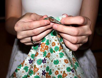 Таким чином, форма вашої спідниці буде схожим на величезний зрізаний конус. Налаштуйте вашу швейну машинку так, щоб швейні стібки були максимально великими. Замість выточек, які присутні більшості спідниць, ви тільки прострочіть верхню частину спідниці простим широким стібком (прострочки підлягає тільки частина у необроблених кінців тканини, які будуть з’єднуватися з майкою).