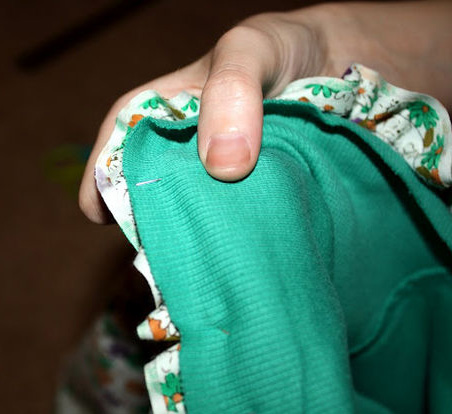 Виверніть спідницю навиворіт, так щоб її необроблені краї з’єднувалися зовні з лицьовою стороною необроблених країв маки (як показано на малюнку). Після чого ви легкими стібками приметаете майку до спідниці.