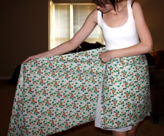 Ну а наше плаття продовжує свій шлях від задуму до створення. Зробіть спідницю, склавши тканину навпіл. Після потрібно зшити бічні краї тканини між собою, тим самим створюючи спідницю (виходить чотиришарова спідниця до плаття).