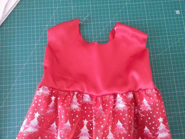 Це робиться одним швом (я не робила спідницю дуже широкою, тому що блискуча тканина різдвяних ялинок досить щільна і не дуже добре збирається), я підбила підкладку одним бічним швом на корсажі.