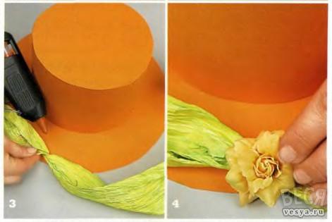 Для висоти капелюхи креслимо прямокутник шириною 10-15 см і довжиною дорівнює обхвату голови додати 2 див. При вирізанні смуги також залишаємо місце для зубчиків. Спочатку приклеюємо смужку до полів капелюха, потім зубчиками до верхньої частини. Наш головний убір готовий. Тепер треба його тільки оформити. Оформлення буде залежати від моделі, кольору, фактури тканини вашого основного наряду.