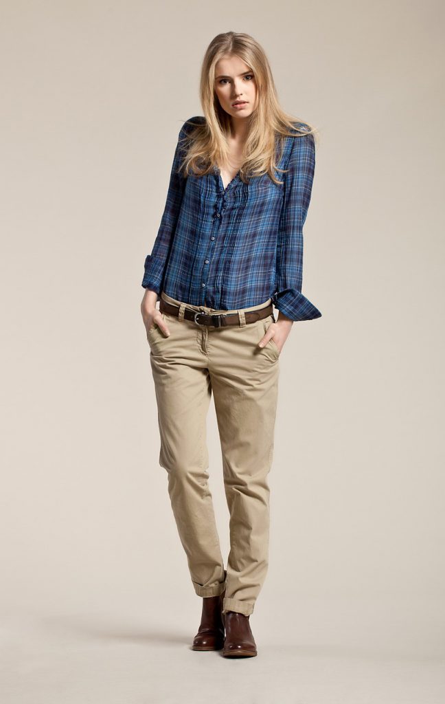 - Штани-чінос в гарберобе поєднуються з тими ж речами, що й джинси: різноманітні сорочки, футболки, спортивне взуття, каблук. А красиві і розкішні речі з ними зазвичай не носять — все просте, повсякденне і з натуральної тканини.