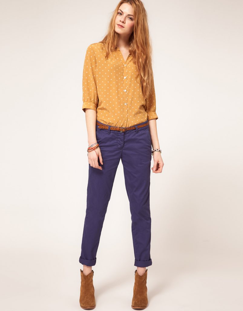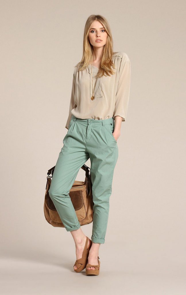 - Якщо жінка володіє вишуканим смаком і вміло поєднує речі, то вона може придбати також такий цікавий варіант забарвлення чіносов, як помаранчевий, м’ятний або бордо.