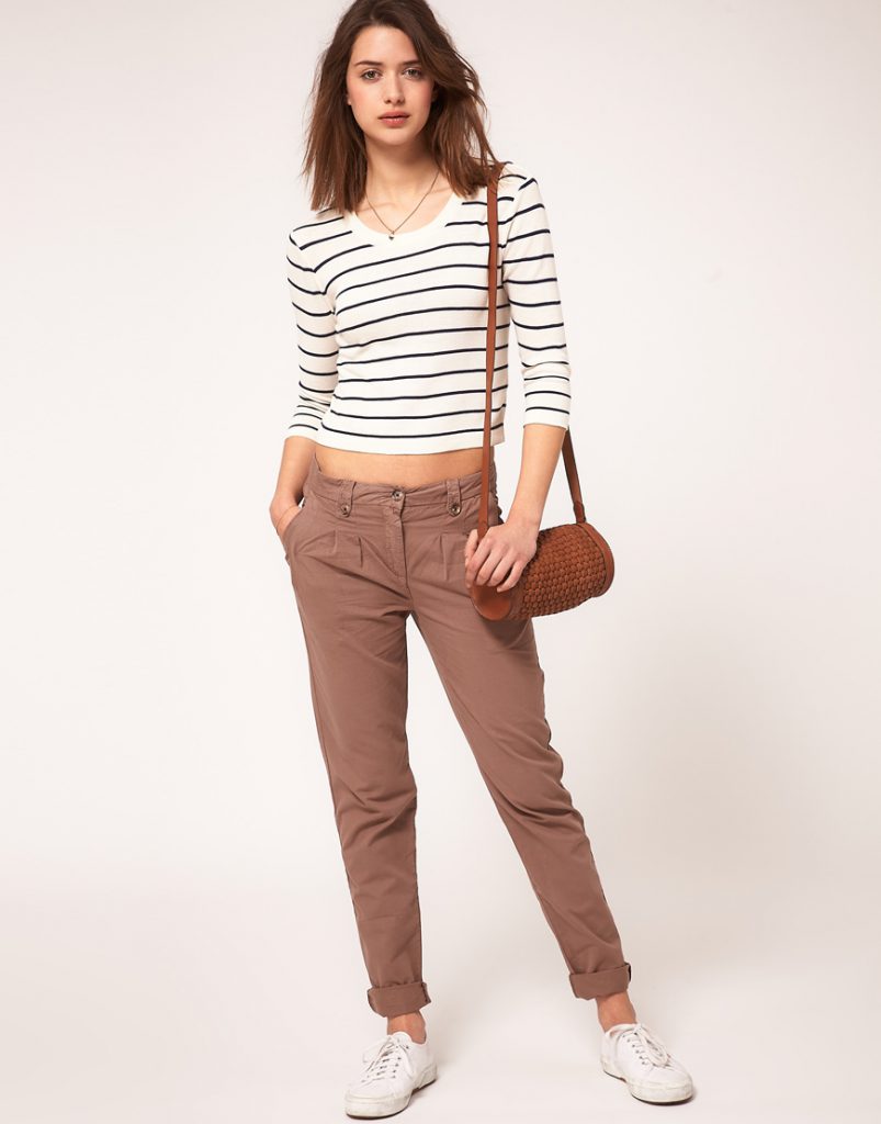 - Молоді дівчата можуть носити брюки-чінос разом з кедами. Такий варіант виглядає сучасно і в дусі актуальною міської вуличної моди.