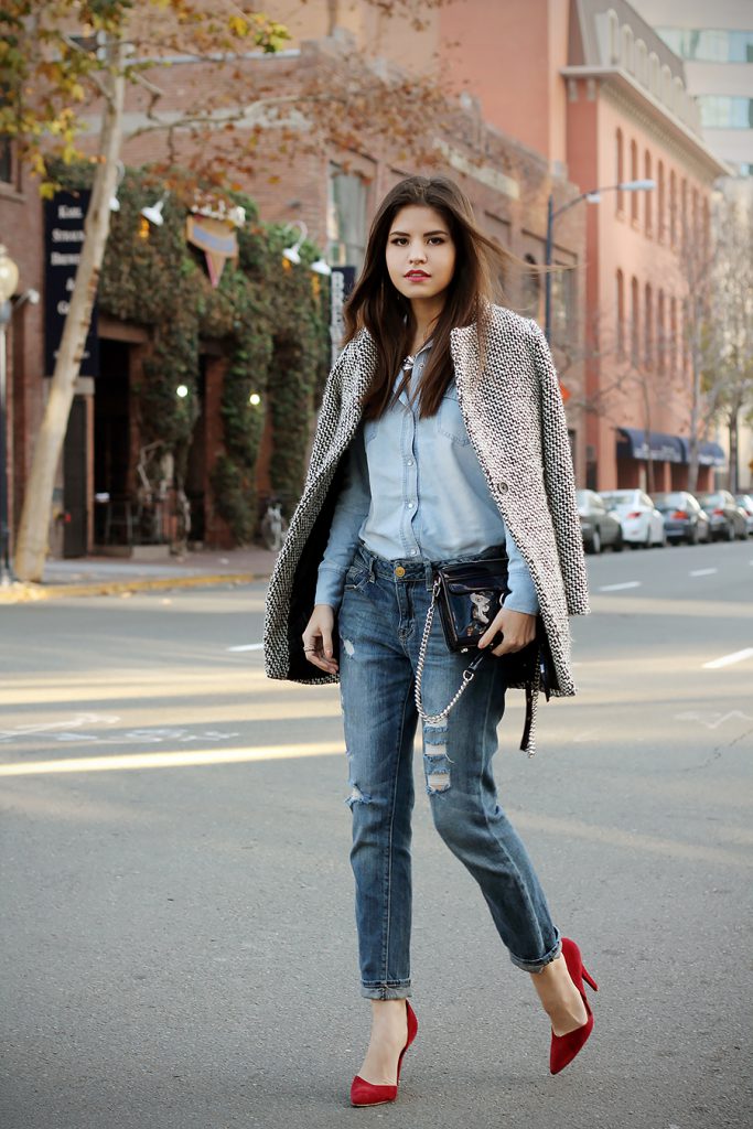 - Денім. Будь-який одяг з деніму чудово поєднується з червоною взуттям. При цьому можна додавати всілякі прикраси у вигляді великих сережок або браслета. Червона помада на губах доповнить образ, робить його свіжим і соковитим.