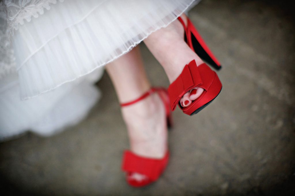 Здавалося б, з чим носити червоні туфлі вже гранично ясно, але що робити, якщо справа стосується весілля? Адже червоний колір – колір любові і чуттєвості, і для весілля вони підходять найкраще! У цьому випадку можна вибирати лаковані моделі, туфлі з бантами і всілякими прикрасами. Підійдуть вони як червоний, так і під білосніжна сукня.