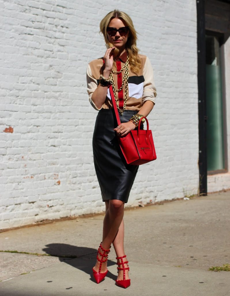 - Одяг червоного кольору. Сміливий варіант – червоне строга сукня без надмірностей або червона спідниця-олівець. Головне-уникати малюнків і глибокого декольте.