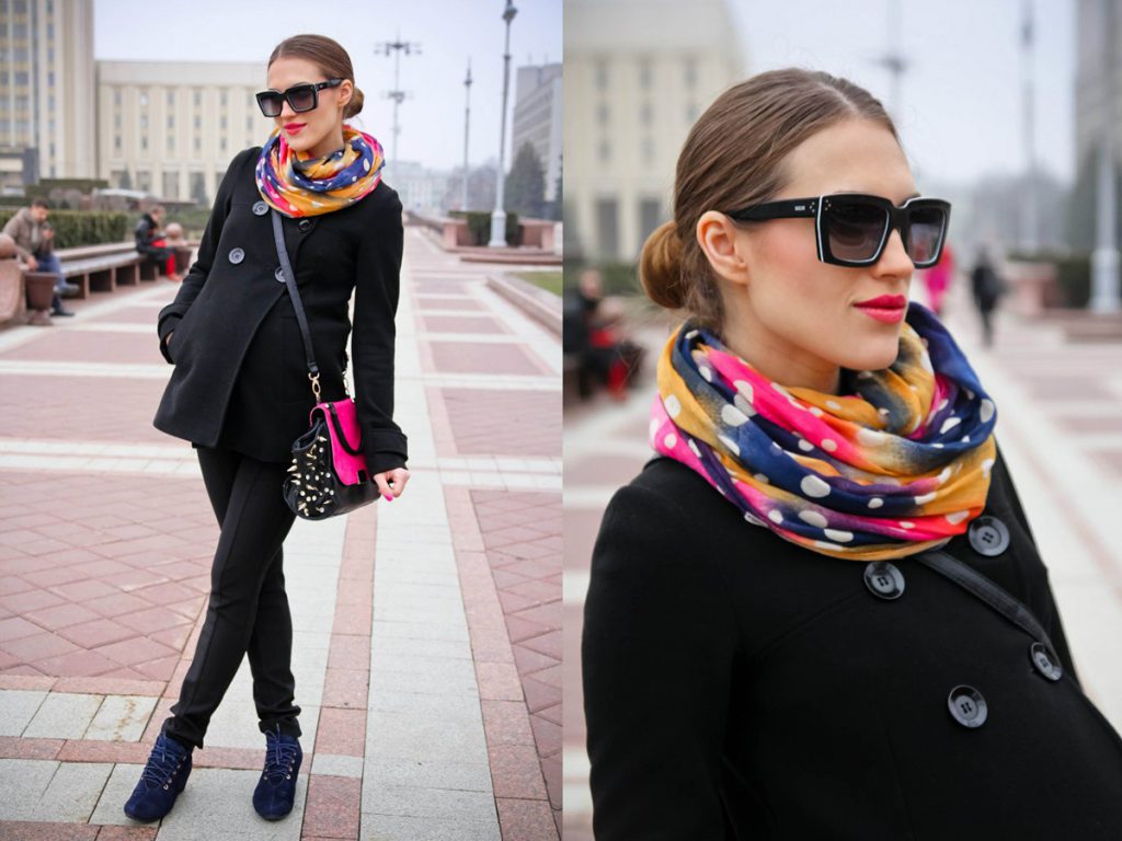 Набір кольорових шарфів, шийних хусток і шалей – найпростіший спосіб змінити образ. Сміливо грайте з забарвленням, але завжди підбирайте шарфи під свій кольоротип.