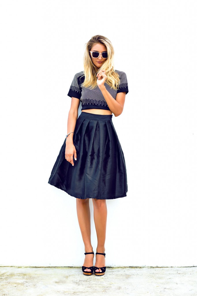 Коротка чорна спідниця в поєднанні з блискучим топом як не можна краще підійде для вечірки. Отримавши в додаток парою трійкою різноманітних пасків можна сміливо експериментувати з вечірніми туалетами.